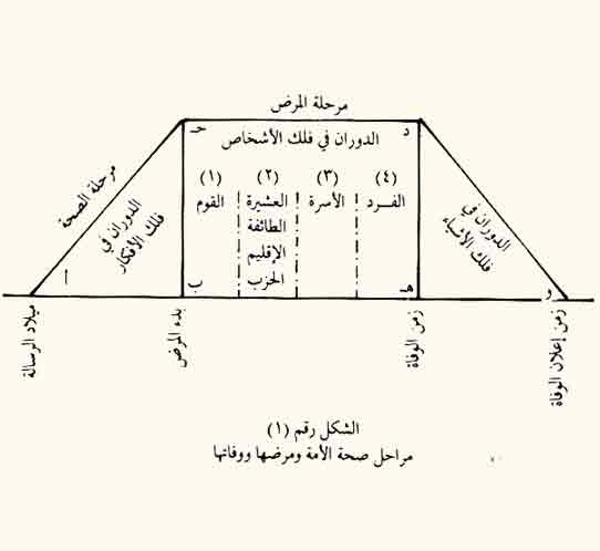 يرمز إلى مرحلة صحة الأمة في الشكل رقم (1) بالمثلث أ، ب ج، حيث تبدأ بميلاد الرسالة عند المحطة الزمنية أ حتى إذا تم إخراج الأمة، وبلغت درجة النضج، كانت حقيقة " المثل الأعلى " الذي يوجه الحياة في الأمة هـي: دوران الأشخاص والأشياء في فلك " الأفكار " الرسالة وتطبيقاتها.