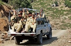 File photo shows Pakistani troops travelling to the site of a US air strike in North Waziristan.