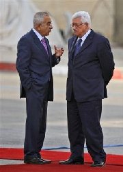 Palestinian President Mahmoud Abbas, right, talks with his Prime Minister Salam Fayyad, at Abbas headquarters in the West Bank city of Ramallah, Thursday, Oct. 15, 2009