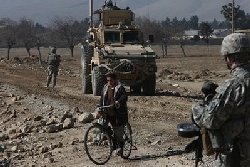 An Afghan villager passes US soldiers, near Bargram Air Base, about 60 kms from Kabul.