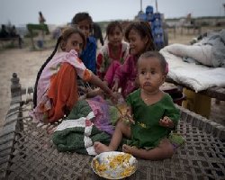 Pakistanis children displaced by floods have dinner at their temporary shelter at Makli Hill grave yard, Sindh province, southern Pakistan, Monday, Aug. 30, 2010.