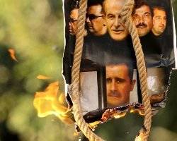 A hangman's noose is used to condemn former Syrian president Hafez al-Assd (top, centre), his sons (top, left to right) and current president, Bashar al-Assad, (bottom, centre) during an anti-regime protest outside the Syrian embassy in the Cypriot capital of Nicosia on July 31.