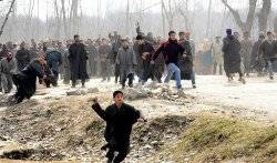 Kashmiri demonstrators throw rocks at Indian police during a protest in Lesar village in the Rafiabad area of Baramulla district, some 75 km from Srinagar.