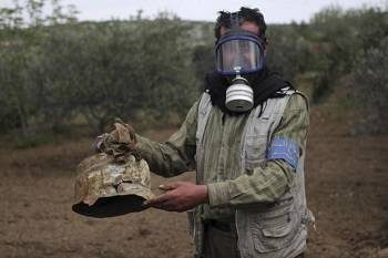 A Civil Defence member carries a damaged canister in Ibleen village from what activists said was a chlorine gas attack, on Kansafra, Ibleen and Josef villages, Idlib countryside May 3, 2015. REUTERS