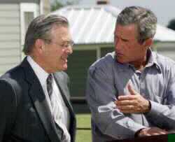 President George W. Bush talks with Defense Secretary Donald Rumsfeld at Bush's Crawford, Texas ranch during a news conference August 21, 2002. Bush said he would continue to consult with U.S. allies on how to deal with Iraq, saying he was a 'patient man' but remained committed to removing Saddam Hussein. (Rick Wilking/Reuters)