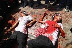 Muslim activists perform as Rohingya victims during a protest outside the Myanmar embassy in Jakarta August 9, 2012.